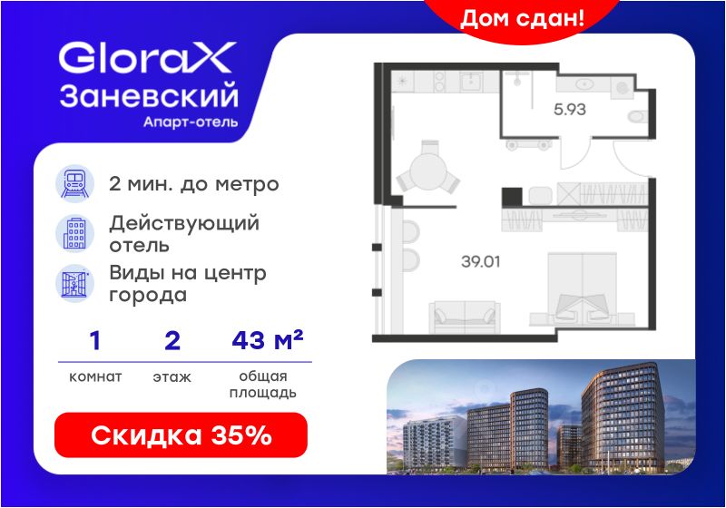 Продается 1-комн. апартамент на 2-м этаже в Апарт-отеле "GloraX Заневский" с сервисом 4*. Старт работы отеля - декабрь 2024 г.! Общая площадь лота составляет 44,94 кв. м, из которых 39,01 кв. м отведено под жилую. Номер апартамента - 209.