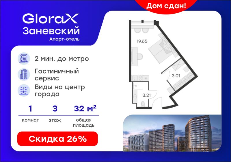 Продается апартамент-студия на 3-м этаже в Апарт-отеле "GloraX Заневский" с сервисом 4*. Старт работы отеля - декабрь 2024 г.! Общая площадь лота составляет 25,87 кв. м, из которых 19,65 кв. м отведено под жилую. Номер апартамента - 325.