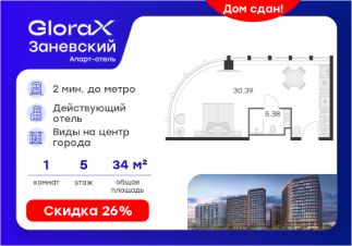 Продается апартамент-студия на 5-м этаже в Апарт-отеле "GloraX Заневский" с сервисом 4*. Старт работы отеля - декабрь 2024 г.! Общая площадь лота составляет 35,77 кв. м, из которых 30,39 кв. м отведено под жилую. Номер апартамента - 523.