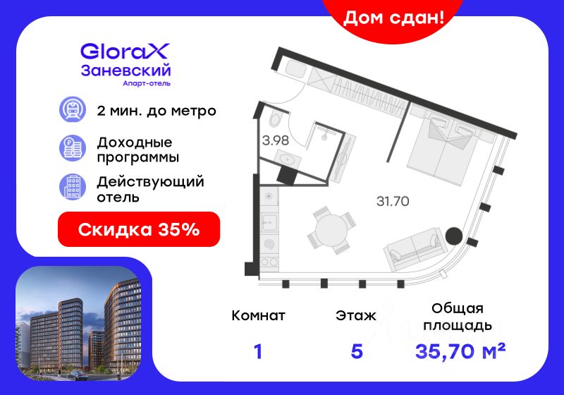 Продается апартамент-студия на 5-м этаже в Апарт-отеле "GloraX Заневский" с сервисом 4*. Старт работы отеля - декабрь 2024 г.! Общая площадь лота составляет 35,68 кв. м, из которых 31,70 кв. м отведено под жилую. Номер апартамента - 545.