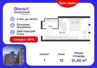 Продается апартамент-студия на 12-м этаже в сданном Апарт-комплексе бизнес-класса "GloraX Заневский". Ключи сразу! Общая площадь лота составляет 22,07 кв. м, из которых 18,92 кв. м отведено под жилую. Номер апартамента - 1 218.