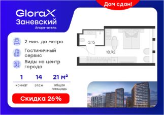 Продается апартамент-студия на 14-м этаже в сданном Апарт-комплексе бизнес-класса "GloraX Заневский". Ключи сразу! Общая площадь лота составляет 22,07 кв. м, из которых 18,92 кв. м отведено под жилую. Номер апартамента - 1 416.