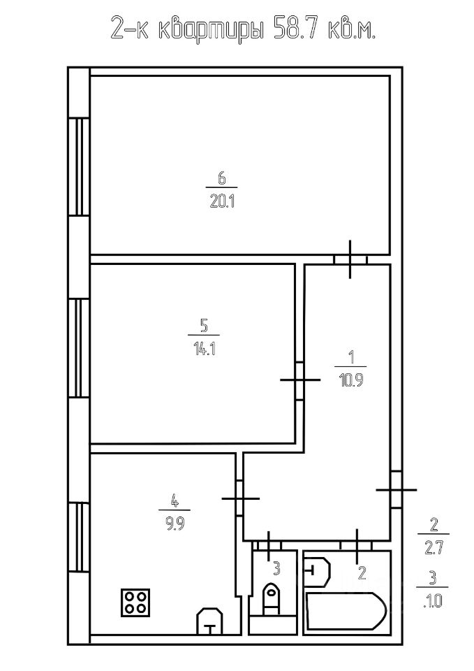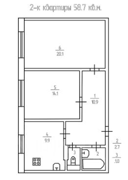 Жилая площадь 34,2 кв.м. Изолированные комнаты 20,1 и 14,1 кв.м. Раздельный санузел. Кухня - 9,9 кв.м. Широкий коридор.