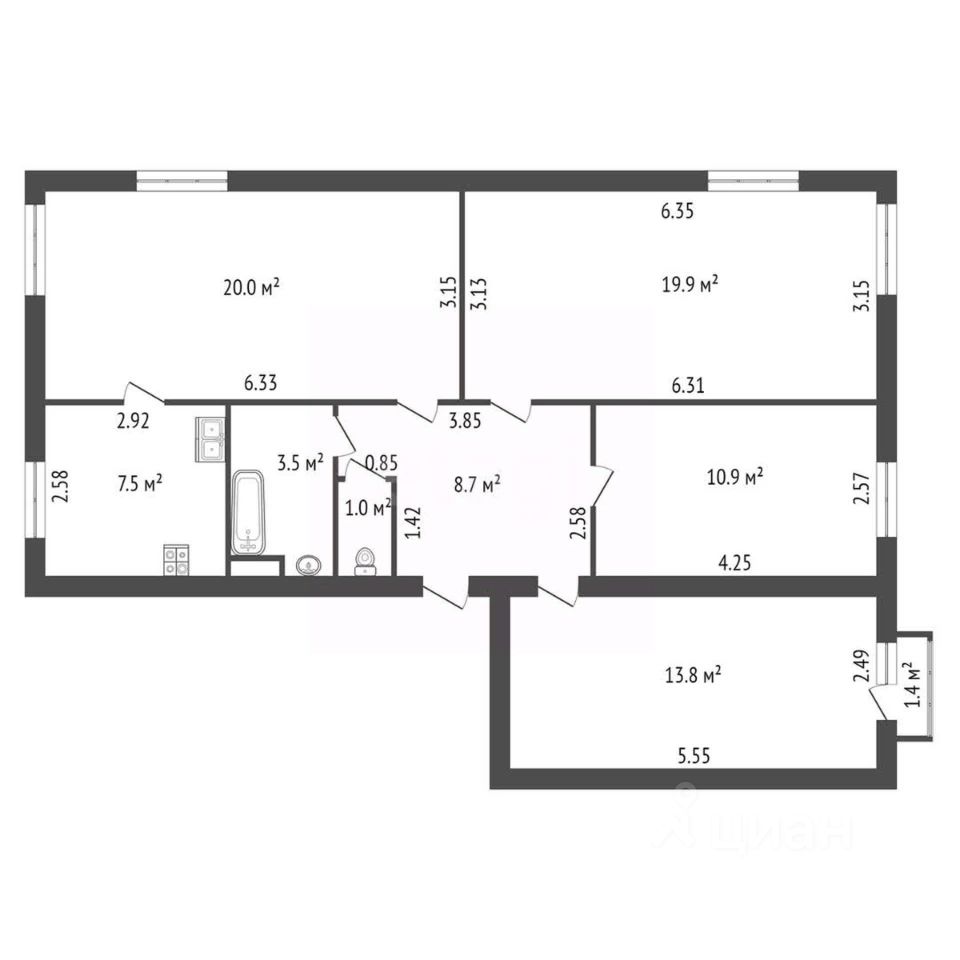 Планировка включает изолированные комнаты (20; 19,9; 10,9; 13,8 кв.м), кухню 7,5 кв.м, просторную прихожую (8,7м2), раздельный санузел.