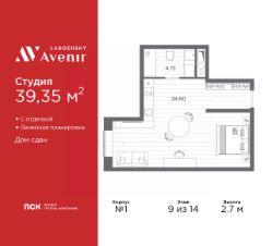 Просторные 1-комн. апартаменты-студия с отделкой в ЖК "Ladozhsky AVENIR" на 9 этаже. Общая площадь: 39.35 кв.м., площадь гостиной 34.6 кв.м., из которых 5 кв.м. выделено под кухонную зону. Все окна выходят на одну сторону. В апартаментах один совмещенный санузел. Высота потолков 2.7 м.
