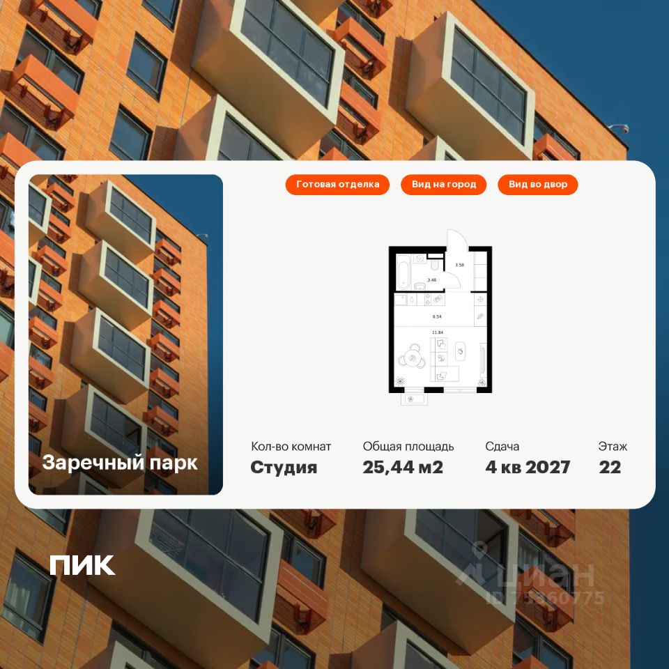 Продаётся квартира-студия площадью 25,44 кв.м на 22 этаже 24 этажного дома (Корпус 5, Секция 2) проекта ПИК Заречный парк. Светлый просторный подъезд на уровне земли, функциональная планировка, большие окна, c отделкой.