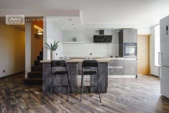 2 спальни и кабинет (можно также использовать как доп. спальню), просторная кухня-гостиная, постирочная зона, гардеробная, огромная терраса.