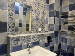 2 санузла — большая ванная и душевая комната (идеально для собачников). Ванная с испанской плиткой, хорошей мебелью и дорогой сантехникой. Обустроенная гардеробная при входе. Также есть маленькая комната под отдельную гардеробную, кладовку или библиотеку.