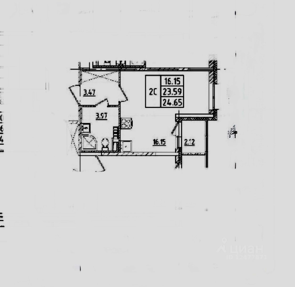Вместительный санузел 3.97 м( для студий это большая редкость)