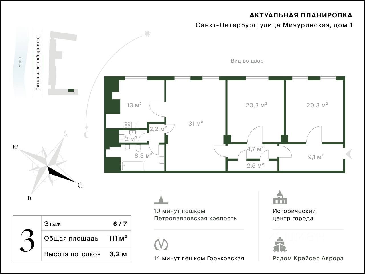 Площадь — 111 м². Высота потолков — 3.3 м. В планировке две изолированные спальни (по 20.3 м²), светлая гостиная (более 30 м²), кухня (13 м²) и два санузла.
