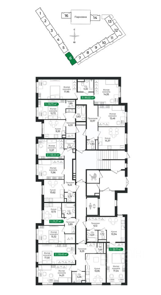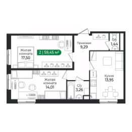 2 - комнатная квартира на 1 этаже общей площадью 59,45 м² в IV очереди в жилом комплексе Сертолово Парк от застройщика ГК Алгоритм.