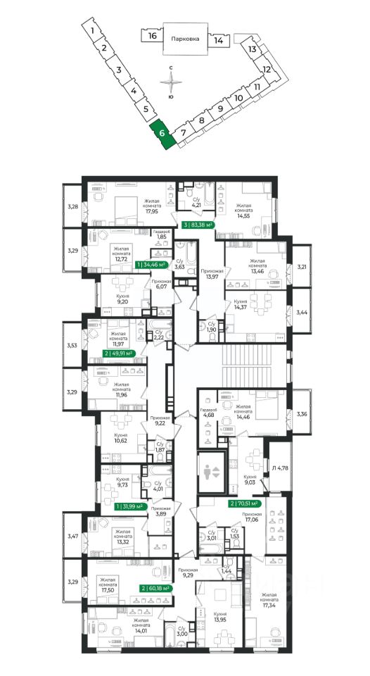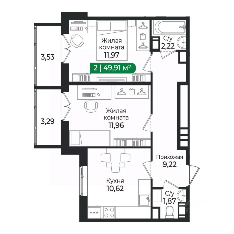 2 - комнатная квартира на 2 этаже общей площадью 49,91 м² в IV очереди в жилом комплексе Сертолово Парк от застройщика ГК Алгоритм.