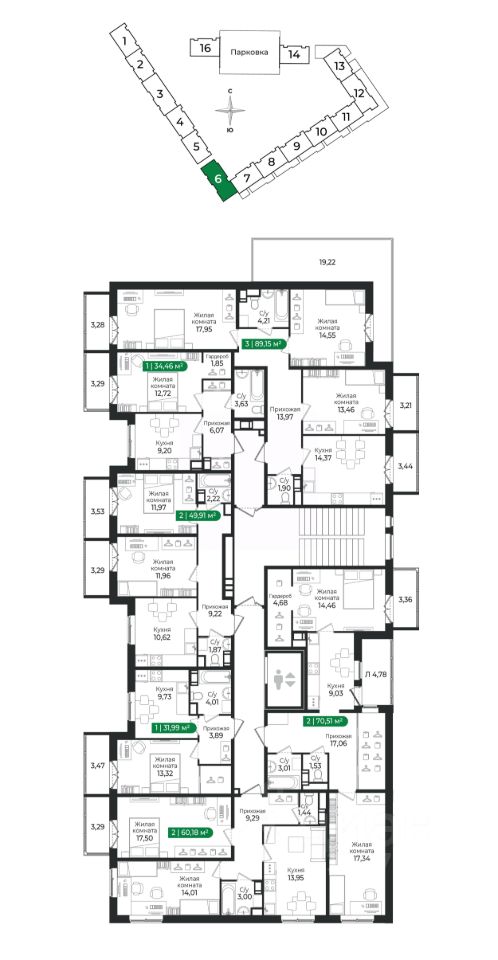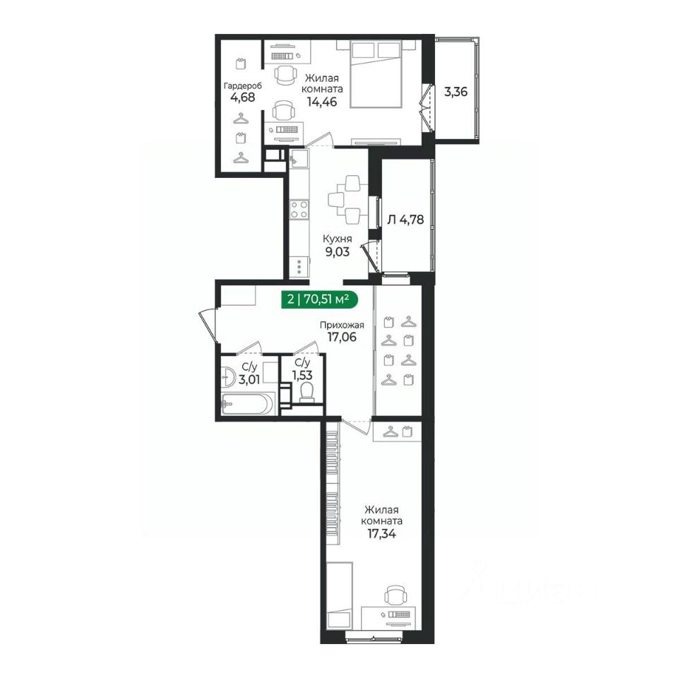 2 - комнатная квартира на 4 этаже общей площадью 70,51 м² в IV очереди в жилом комплексе Сертолово Парк от застройщика ГК Алгоритм.