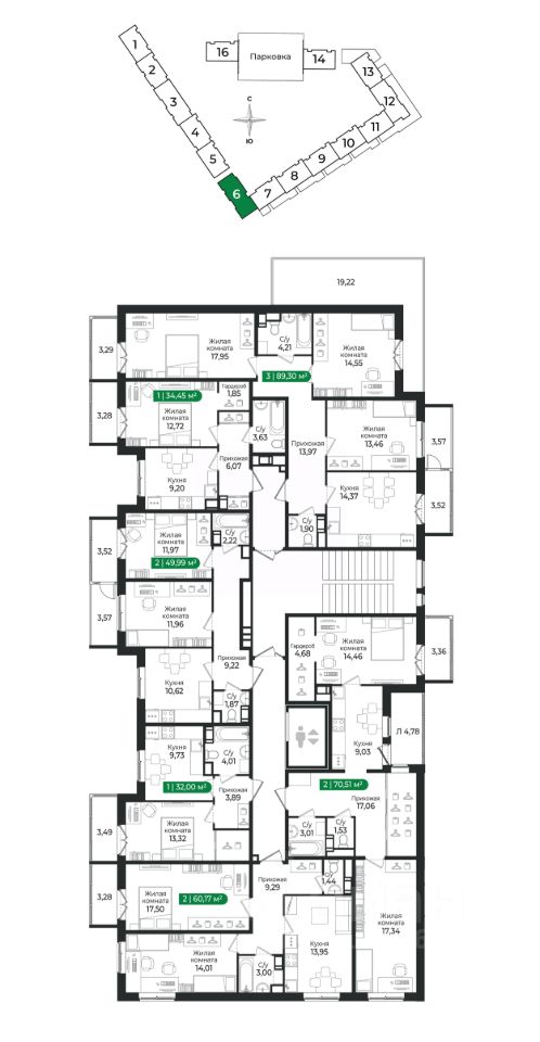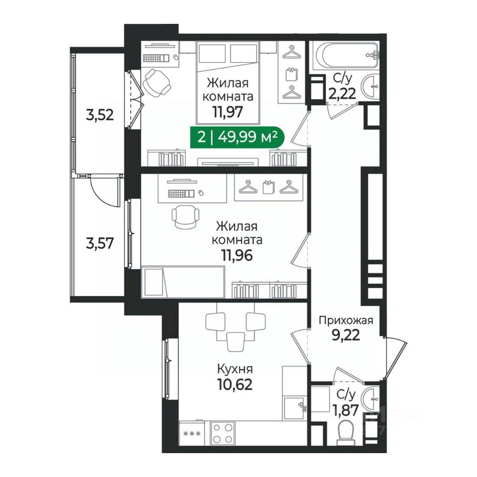 2 - комнатная квартира на 5 этаже общей площадью 49,99 м² в IV очереди в жилом комплексе Сертолово Парк от застройщика ГК Алгоритм.
