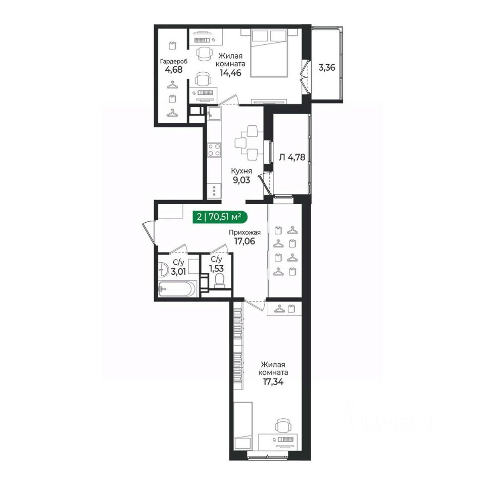 2 - комнатная квартира на 5 этаже общей площадью 70,51 м² в IV очереди в жилом комплексе Сертолово Парк от застройщика ГК Алгоритм.