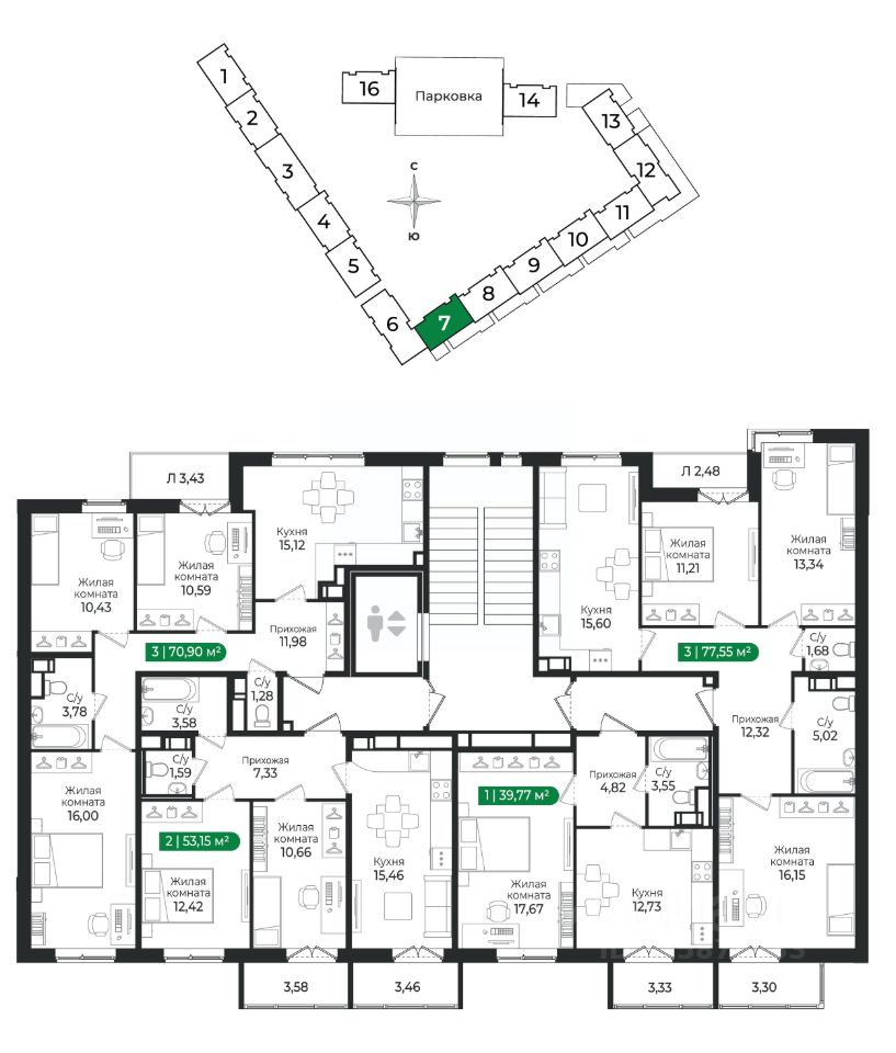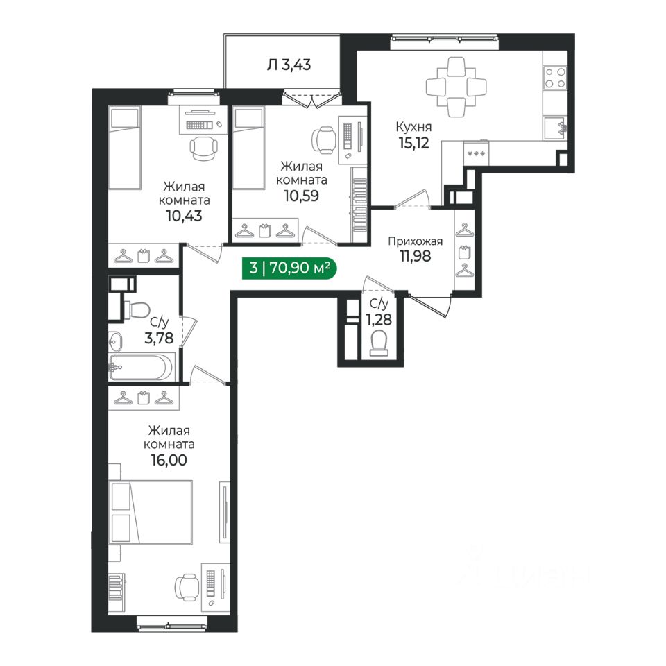 3 - комнатная квартира на 4 этаже общей площадью 70,9 м² в IV очереди в жилом комплексе Сертолово Парк от застройщика ГК Алгоритм.