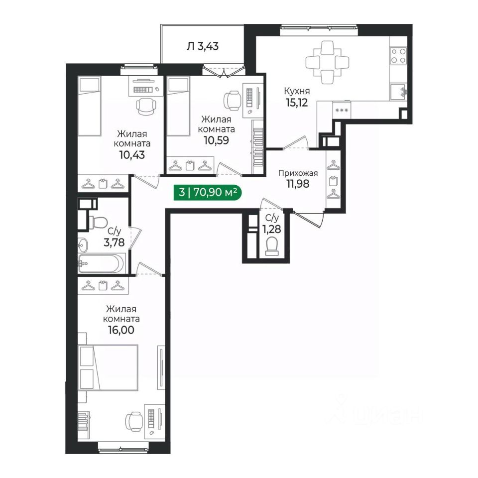3 - комнатная квартира на 6 этаже общей площадью 70,9 м² в IV очереди в жилом комплексе Сертолово Парк от застройщика ГК Алгоритм.