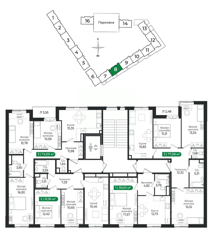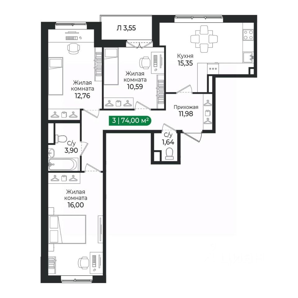 3 - комнатная квартира на 2 этаже общей площадью 74 м² в IV очереди в жилом комплексе Сертолово Парк от застройщика ГК Алгоритм.