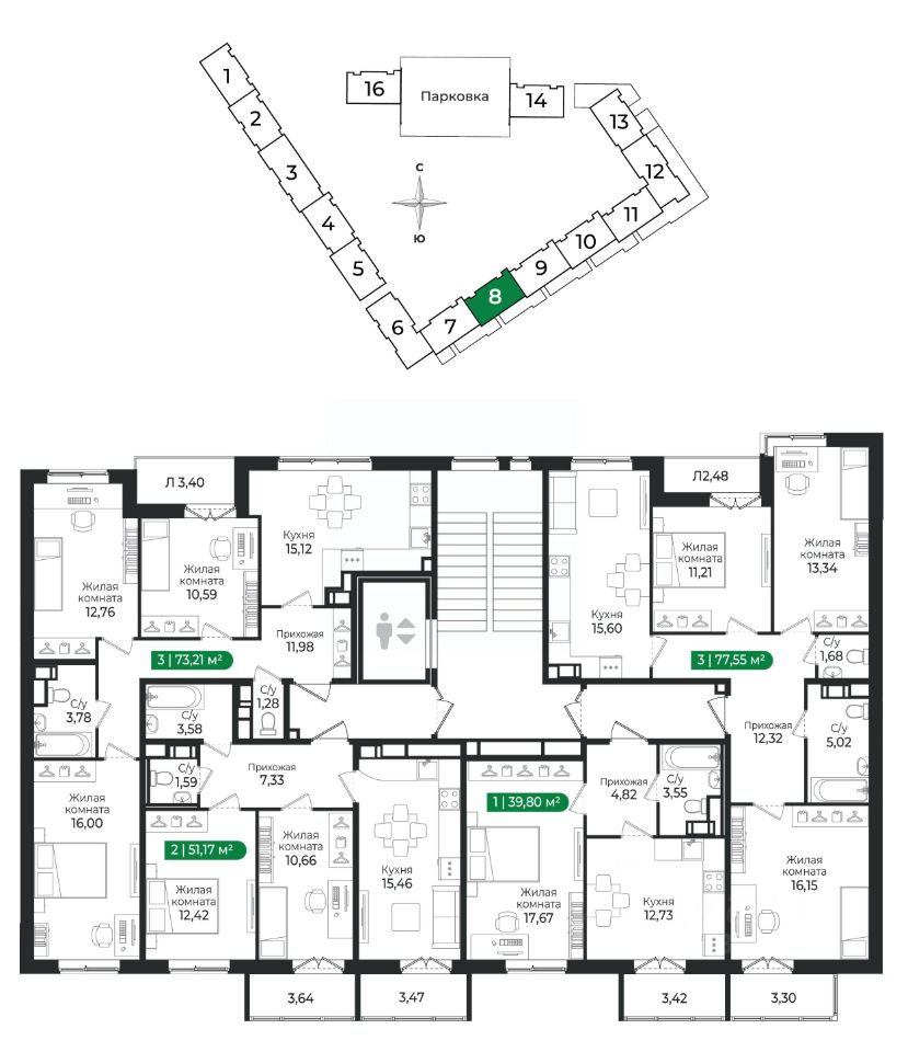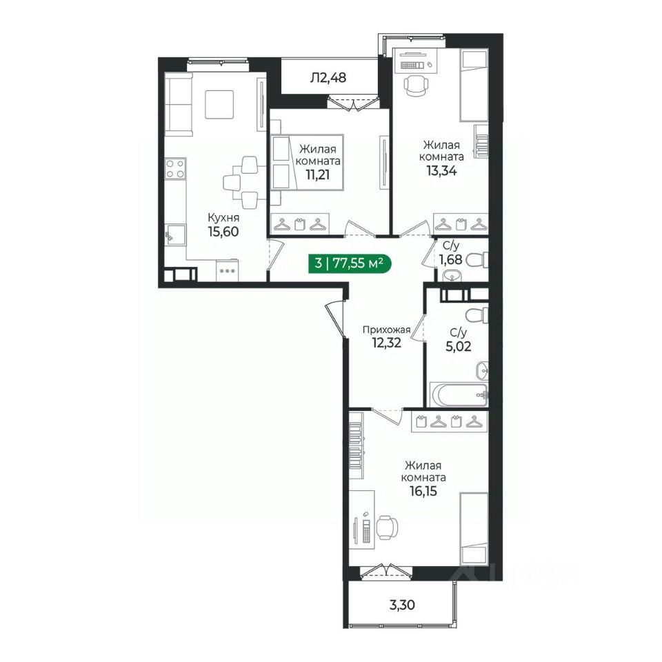 3 - комнатная квартира на 4 этаже общей площадью 77,55 м² в IV очереди в жилом комплексе Сертолово Парк от застройщика ГК Алгоритм.