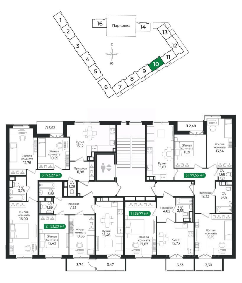 3 - комнатная квартира на 3 этаже общей площадью 77,55 м² в IV очереди в жилом комплексе Сертолово Парк от застройщика ГК Алгоритм.