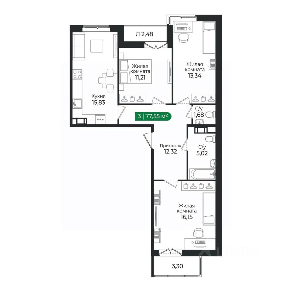 3 - комнатная квартира на 4 этаже общей площадью 77,55 м² в IV очереди в жилом комплексе Сертолово Парк от застройщика ГК Алгоритм.