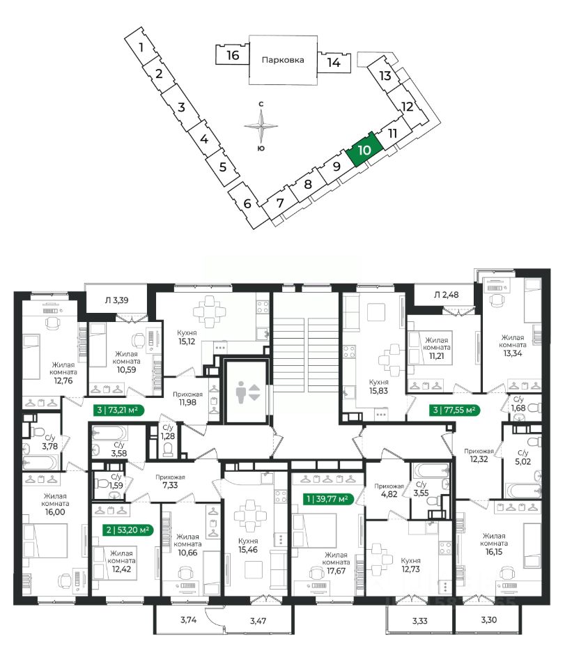 3 - комнатная квартира на 5 этаже общей площадью 73,21 м² в IV очереди в жилом комплексе Сертолово Парк от застройщика ГК Алгоритм.