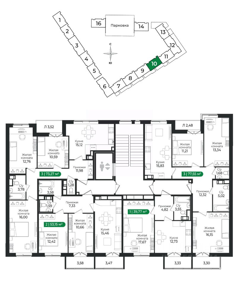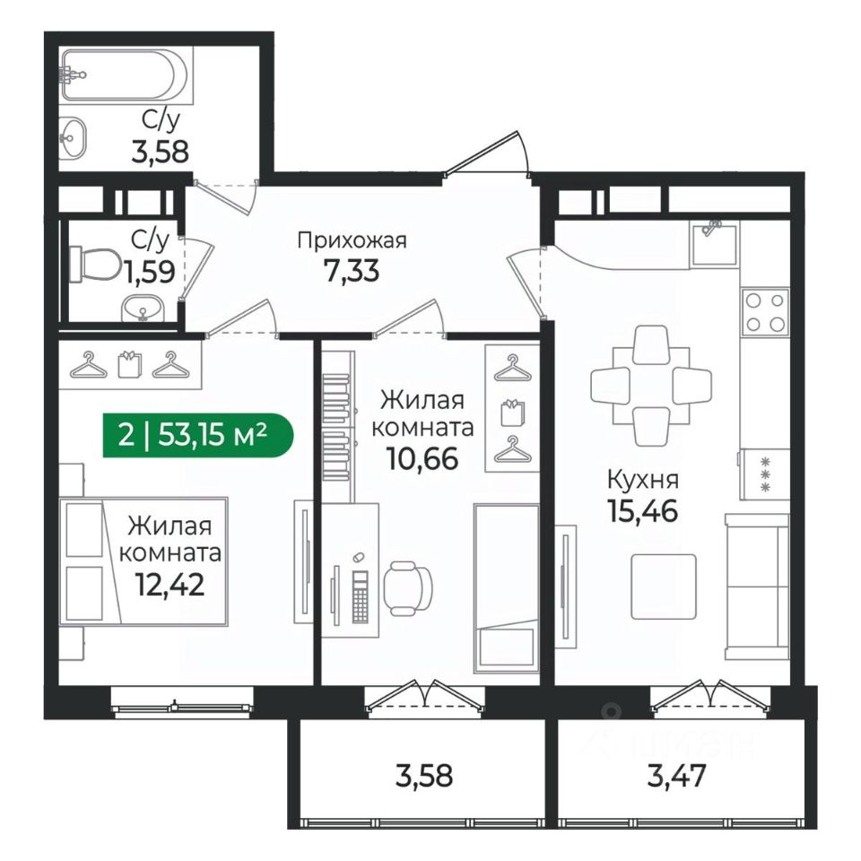 2 - комнатная квартира на 6 этаже общей площадью 53,15 м² в IV очереди в жилом комплексе Сертолово Парк от застройщика ГК Алгоритм.