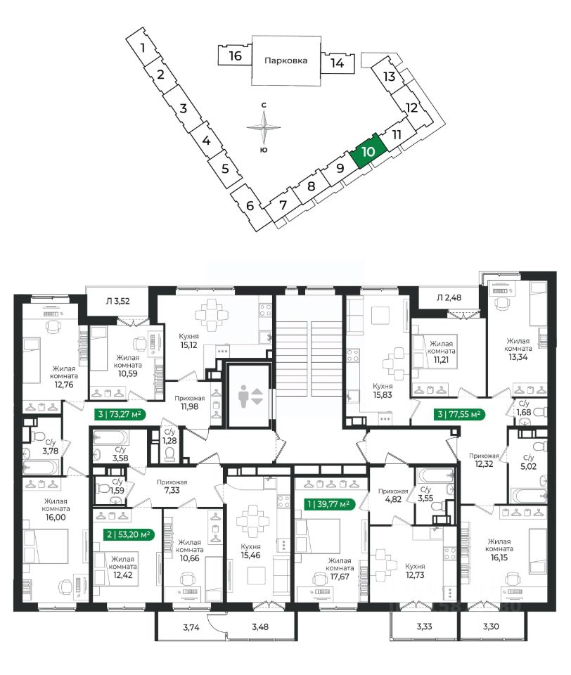3 - комнатная квартира на 7 этаже общей площадью 73,27 м² в IV очереди в жилом комплексе Сертолово Парк от застройщика ГК Алгоритм.