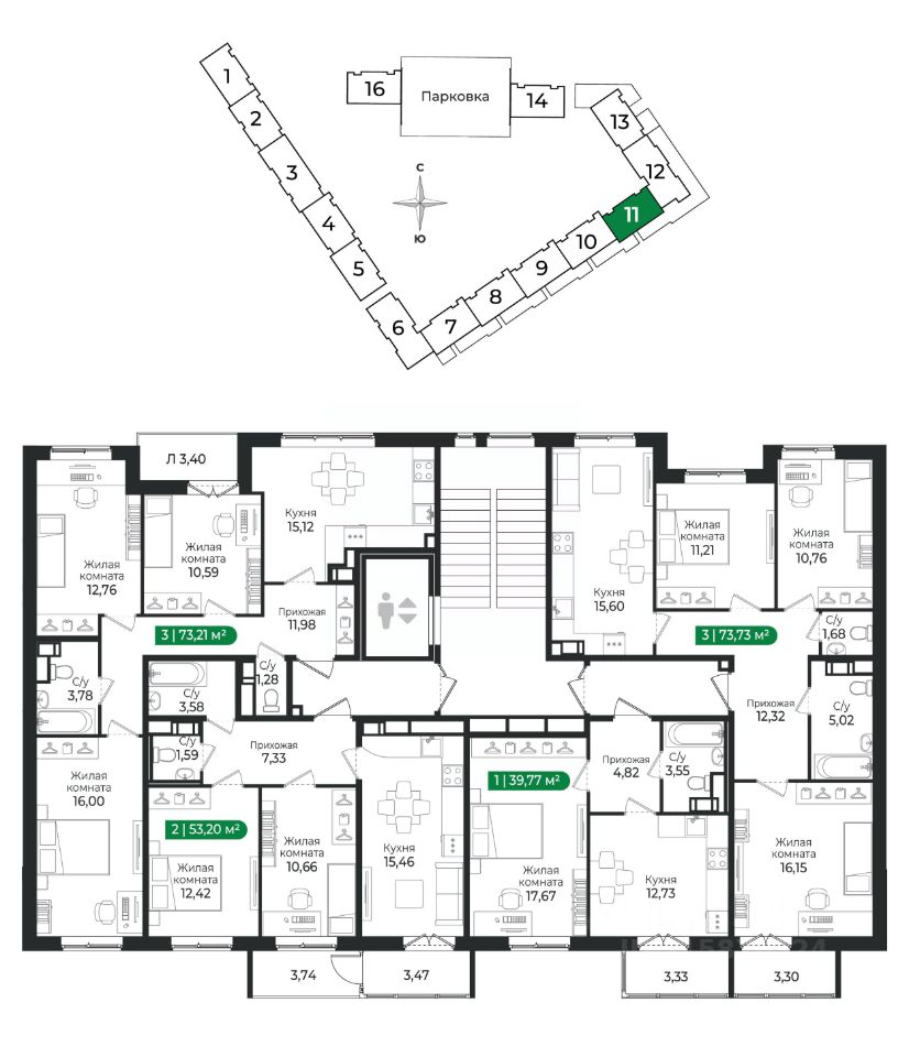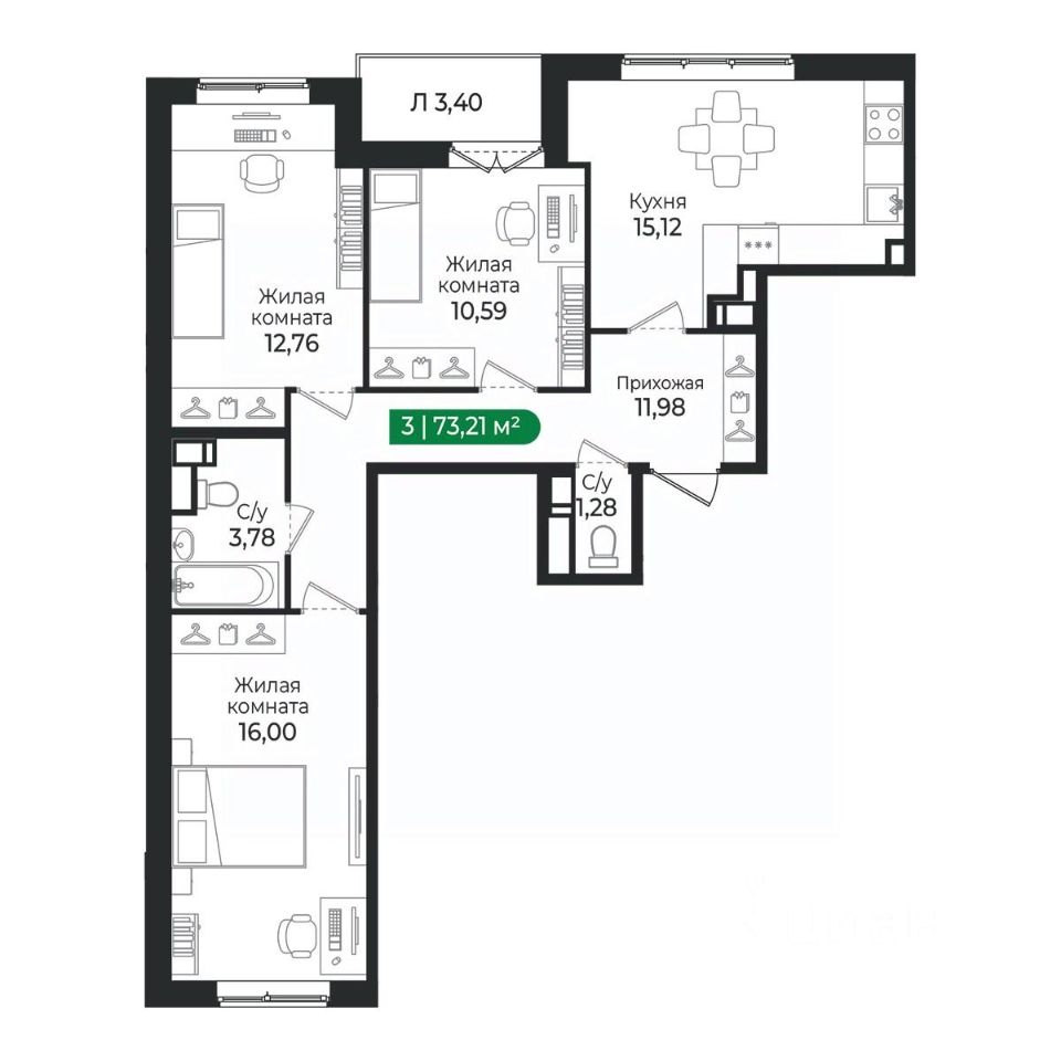3 - комнатная квартира на 5 этаже общей площадью 73,21 м² в IV очереди в жилом комплексе Сертолово Парк от застройщика ГК Алгоритм.