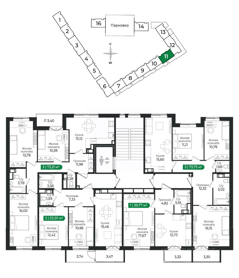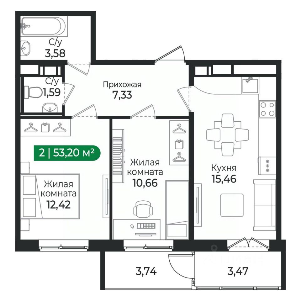 2 - комнатная квартира на 5 этаже общей площадью 53,2 м² в IV очереди в жилом комплексе Сертолово Парк от застройщика ГК Алгоритм.