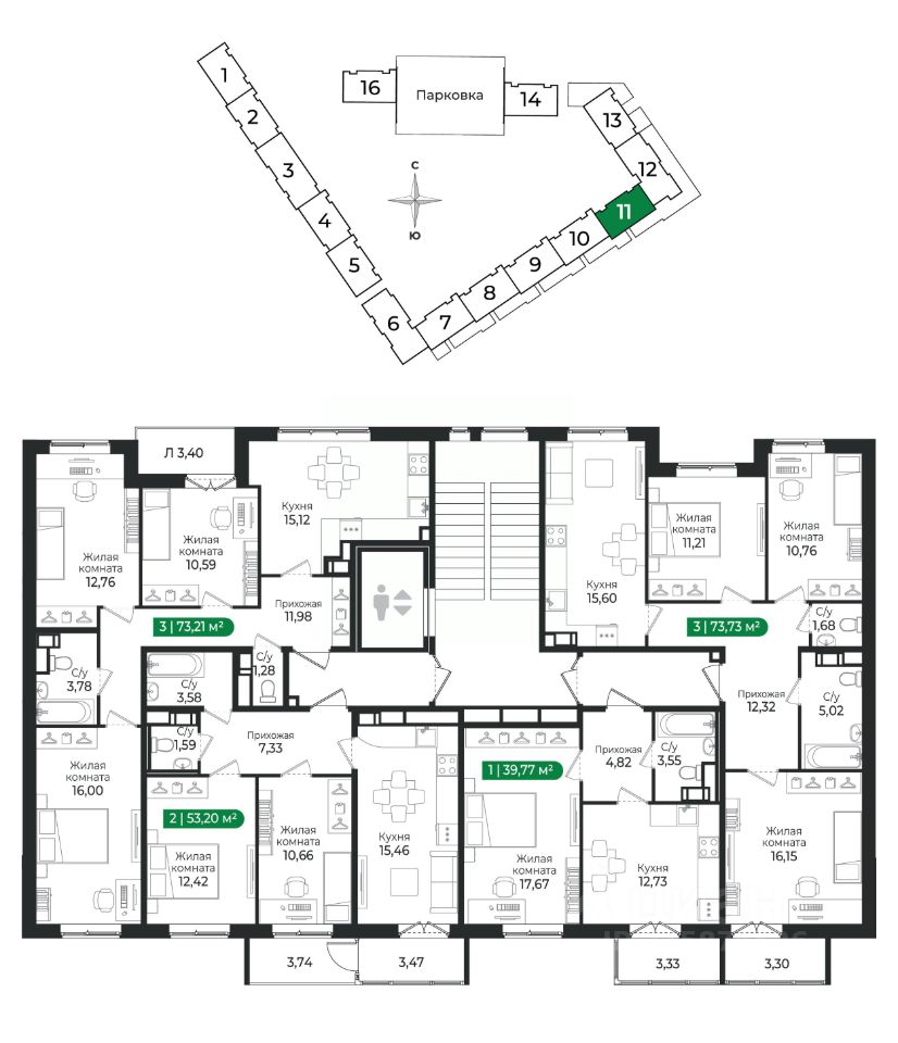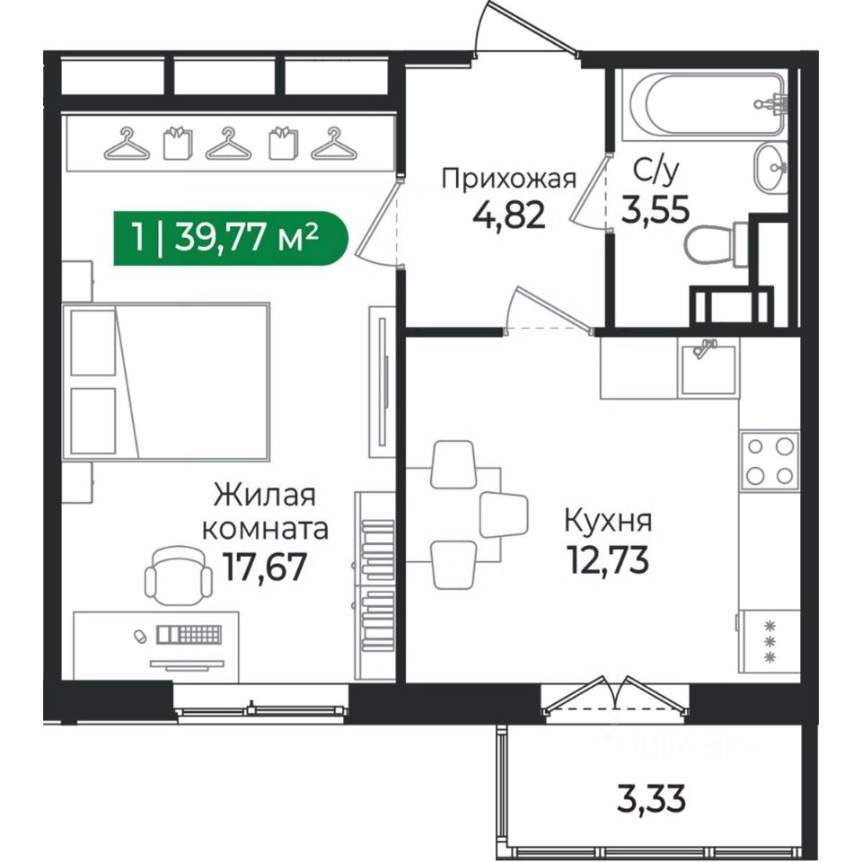 1 - комнатная квартира на 5 этаже общей площадью 39,77 м² в IV очереди в жилом комплексе Сертолово Парк от застройщика ГК Алгоритм.