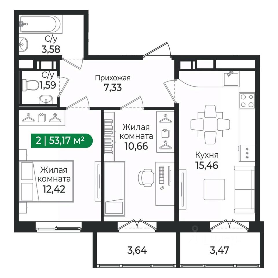 2 - комнатная квартира на 6 этаже общей площадью 53,17 м² в IV очереди в жилом комплексе Сертолово Парк от застройщика ГК Алгоритм.