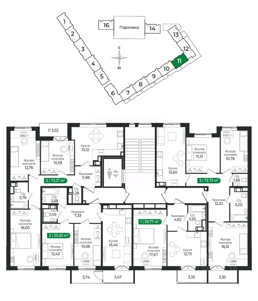 3 - комнатная квартира на 7 этаже общей площадью 73,27 м² в IV очереди в жилом комплексе Сертолово Парк от застройщика ГК Алгоритм.