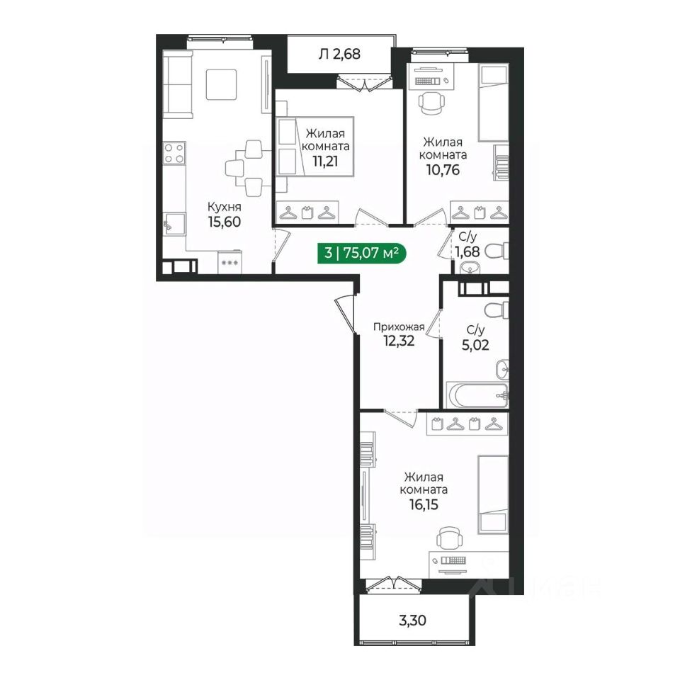 3 - комнатная квартира на 7 этаже общей площадью 73,73 м² в IV очереди в жилом комплексе Сертолово Парк от застройщика ГК Алгоритм.