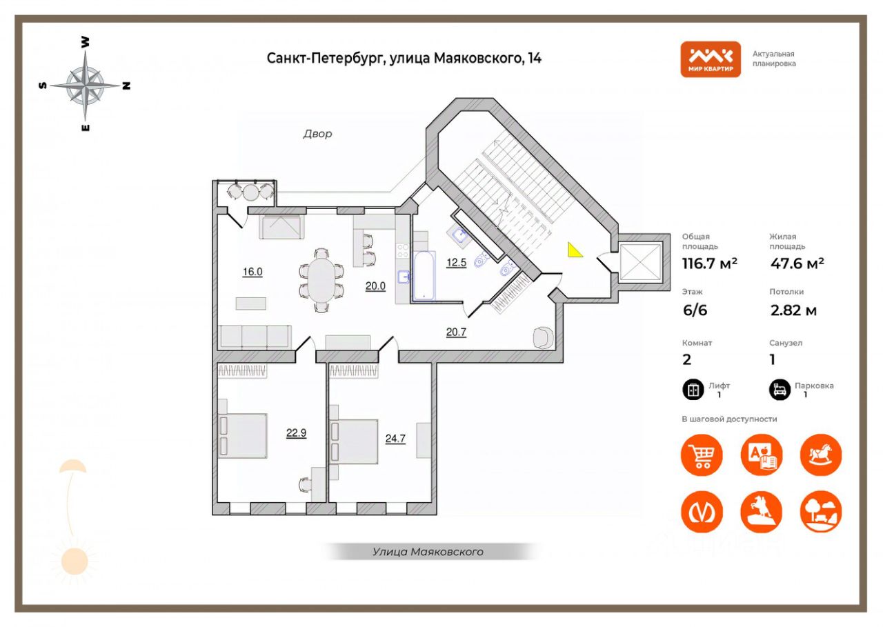 Общая площадь квартиры 116.7 кв.м.. Две спальни 24.7 кв.м. и 22.9 кв.м., кухня-столовая-гостиная 36 кв.м. с балконом. Большой совмещенный сан/узел с окном площадью 12.5 кв.м. Коридор 20.7 кв.м. Высота потолка 2.82 м.