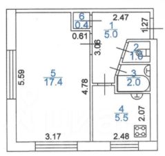 Общая площадь 31,3 кв. м, жилая площадь 17,4 кв. м, кухня 5,5 кв. м.