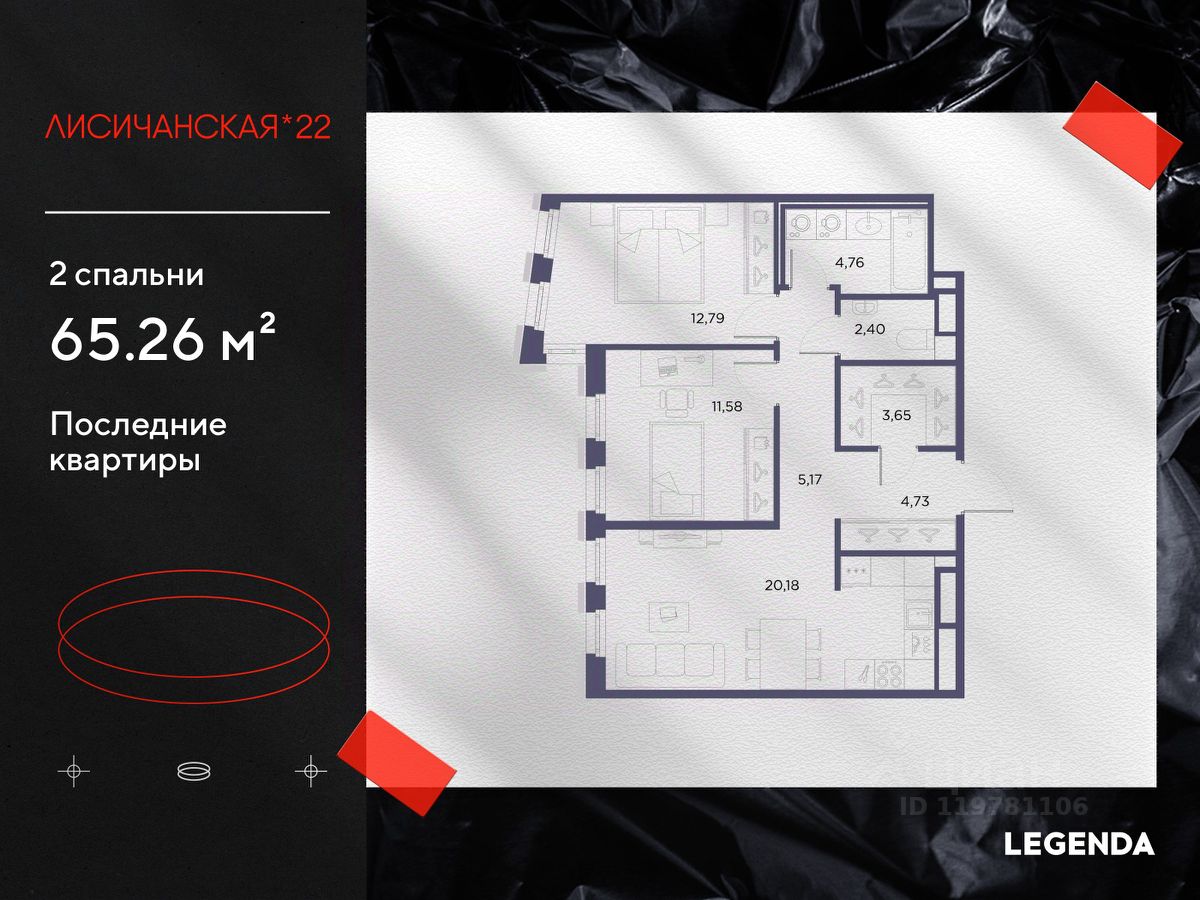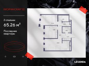 2-комн. квартира от застройщика с предчистовой отделкой в ЖК "Лисичанская, 22" на 4 этаже. Общая площадь: 65.26 кв.м., жилая: 24.37 кв.м., площадь просторной кухни-столовой: 20.18 кв.м. Комнаты изолированные, все окна выходят на одну сторону. В квартире один раздельный санузел. Высота потолков 2.7 м.
