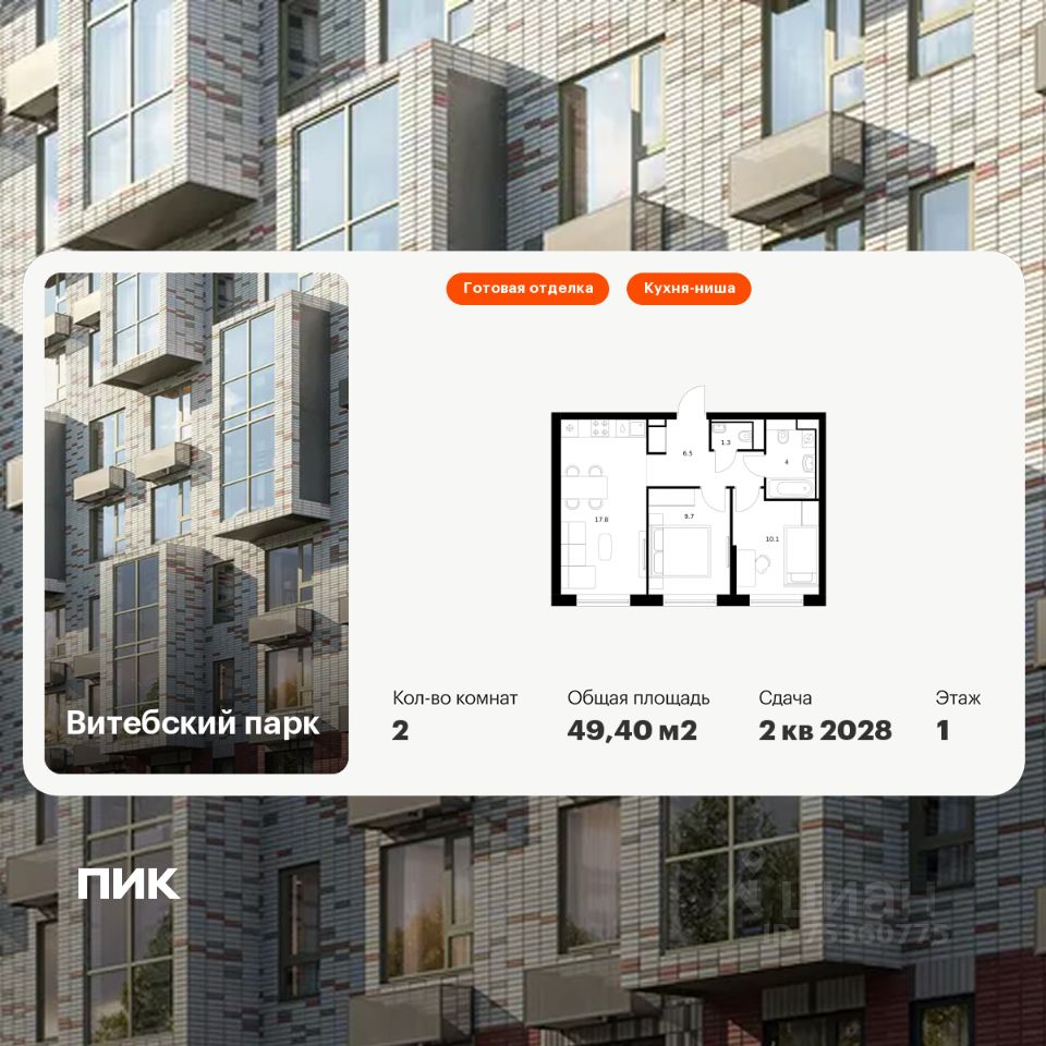 Продаётся 2-комн. квартира площадью 49,4 кв.м на 1 этаже 12 этажного дома (Корпус 7, Секция 4) проекта ПИК Витебский парк. Светлый просторный подъезд на уровне земли, функциональная планировка, большие окна, c отделкой.