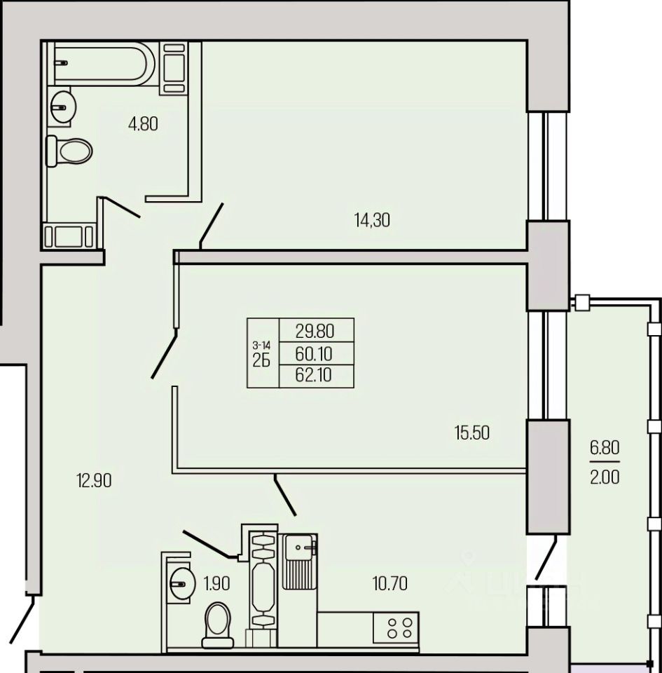 Продаётся 2-комнатная квартира в сданном доме (ул. Железнодорожная, 5А (Дом 1)), срок сдачи: III-кв. 2025, общей площадью 62.1 кв.м., на 8 этаже. Новый жилой комплекс "ЭКОС" от застройщика "ГК Арена" расположен по адресу Ленинградская область, Всеволожский район, Кузьмоловский пгт, Железнодорожная улица.
