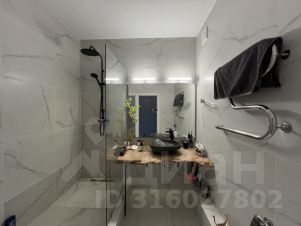 Санузлы: два санузла основной дизайнерский санузел с душевой зоной, раковиной на стильной деревянной столешнице и чёрной матовой сантехникой, и отдельная постирочная с установленной стиральной машиной