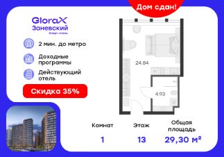Продается апартамент-студия на 13-м этаже в сданном Апарт-комплексе бизнес-класса "GloraX Заневский". Ключи сразу! Общая площадь лота составляет 29,77 кв. м, из которых 24,84 кв. м отведено под жилую. Номер апартамента - 1 308.