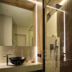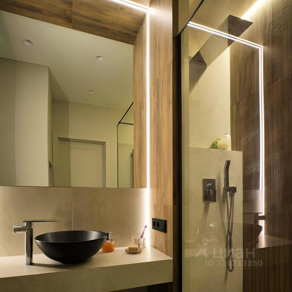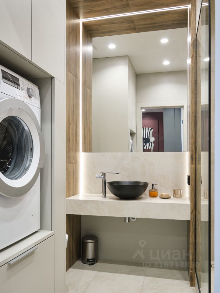 В санузле тропический душ, ненавязчивая подсветка зеркала, подсветка душевой зоны. Также оборудованное место для хранения вещей над стиральной машиной и под ней.