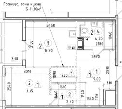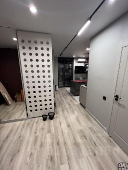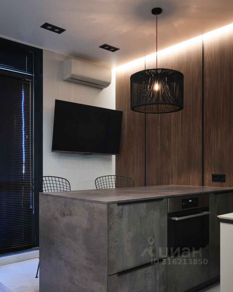 Сделана небольшая перепланировка, смещена межкомнатная перегородка, чтобы визуально расширить кухню. В образовавшемся месте установлен диван, с которого можно смотреть телевизор на поворотном кронштейне. Часть прихожей выделена в отдельную рабочую зону, там можно комфортно расположиться с ноутбуком.