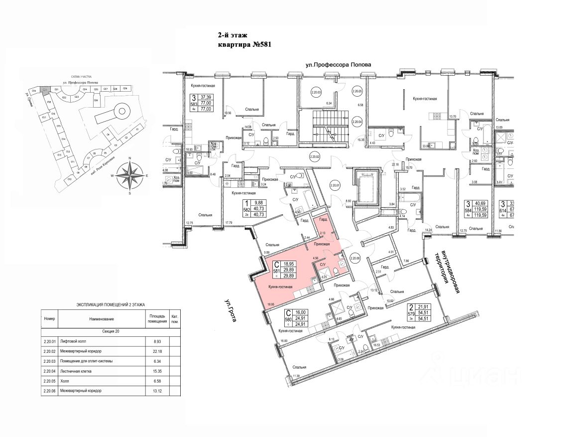 Клубный квартал состоит из 29 секций в 6 этажей, располагается в Петроградском районе Санкт-Петербурга — между улицей профессора Попова и набережной реки Карповка.