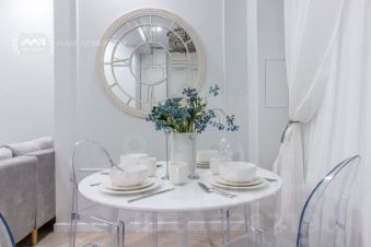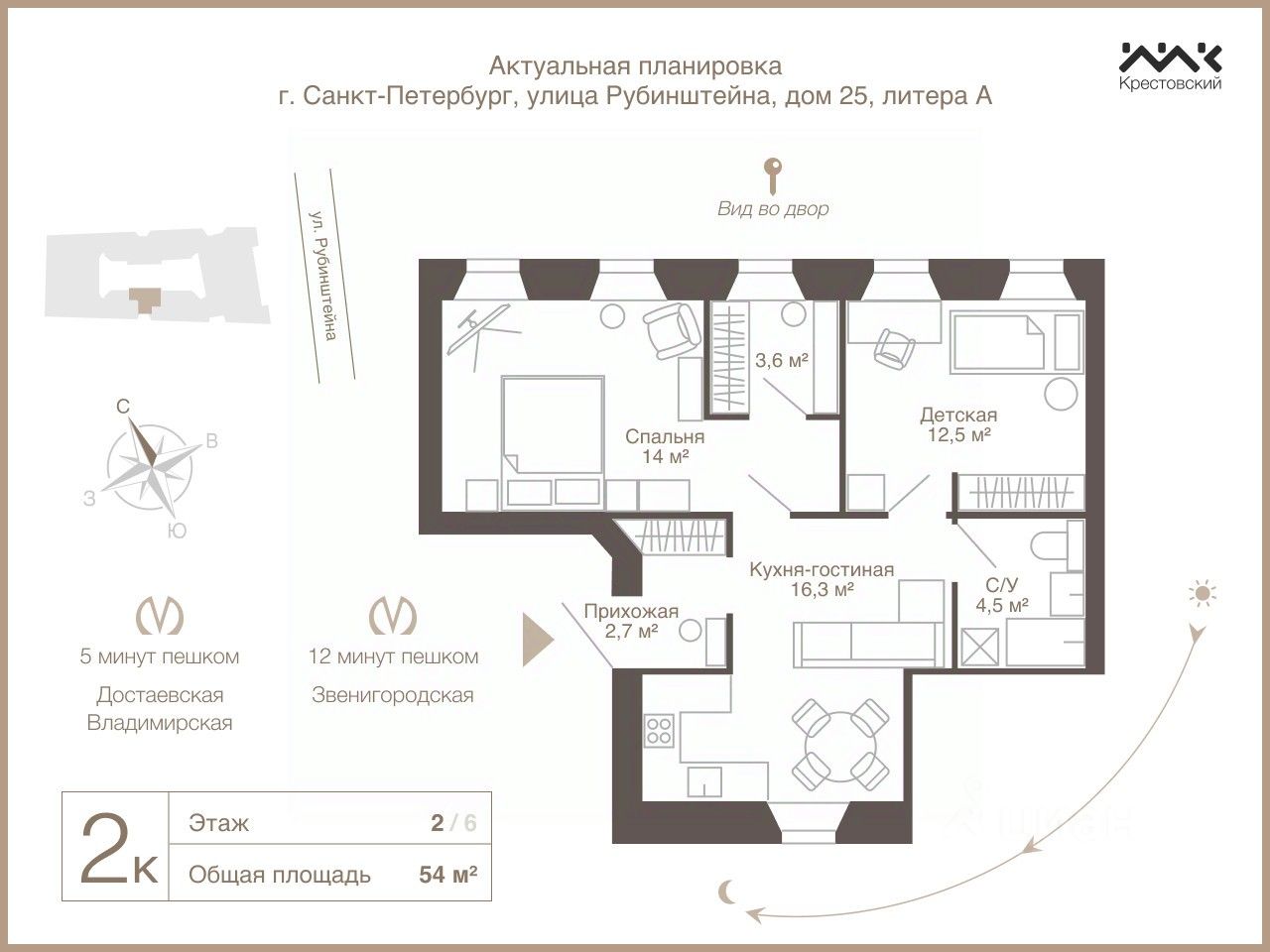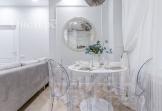 Жилое пространство разделено на зону кухни-гостиной, полностью оборудованную всей необходимой техникой и мебелью для комфортного размещения Ваших гостей, приватную зону спальни с гардеробной для отдыха в уютной атмосфере и еще одну комнату, которую можно оборудовать под спальню, кабинет или детскую. Квартира имеет ряд преимуществ, наделяющих ее уникальной Петербургской атмосферой. Общая площадь квартиры 54 кв. м. Окна квартиры выходят во двор.