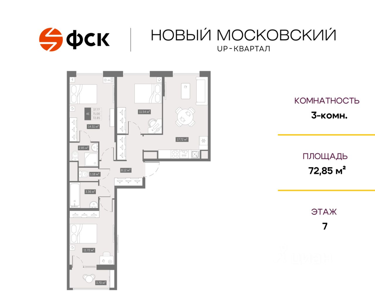 Цена со скидкой до 30% в прямой продаже от застройщика — только в этом месяце. Беспроцентная рассрочка. 3-к квартира в ЖК Up-квартал "Новый Московский" на 7-м этаже. Общая площадь 72,85. Без отделки.
