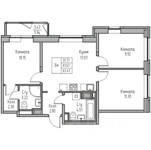 Общая площадь63,41 м²