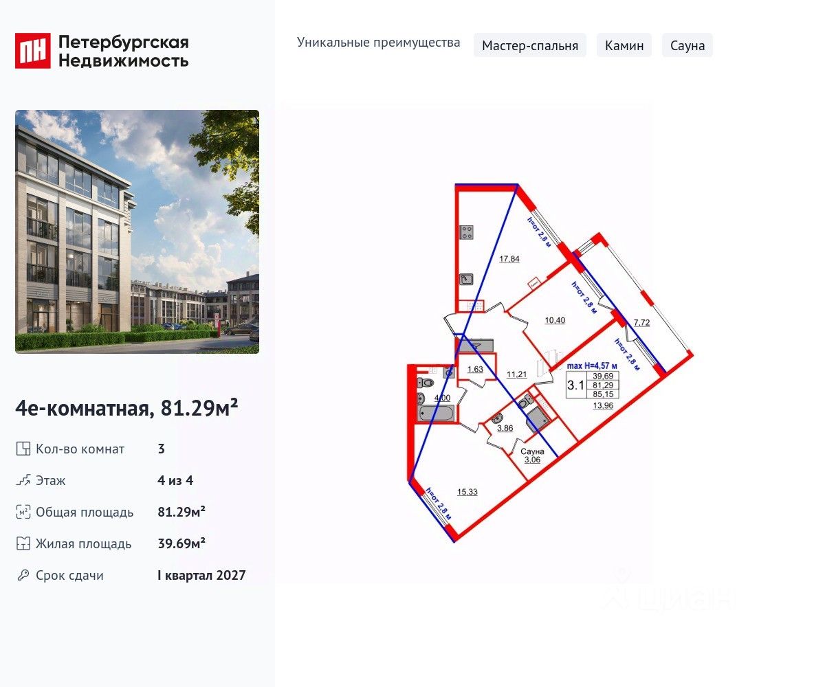 Уникальная, функциональная европланировка, большая кухня-гостиная 17.84 м², вместительная прихожая 11.21 м². Общая площадь квартиры - 81.29 м², жилая 39.69 м².