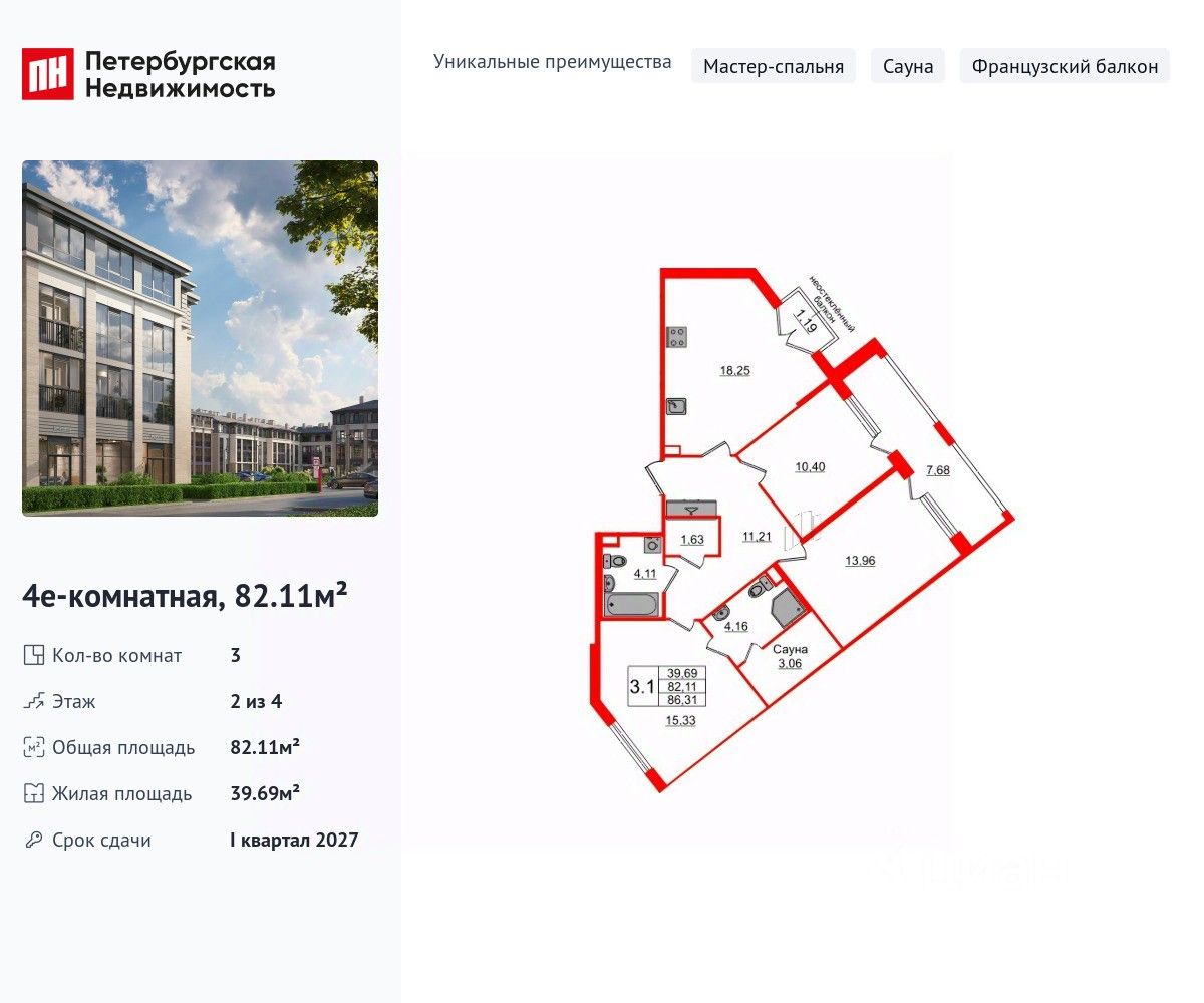 Уникальная, функциональная европланировка, большая кухня-гостиная 18.25 м², вместительная прихожая 11.21 м². Общая площадь квартиры - 82.11 м², жилая 39.69 м², высота потолка 2.75 м.