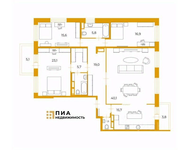 - Просторные комнаты 40,1+16,9+15,6+23,1 кв.м., кухня 15,7 кв. м.